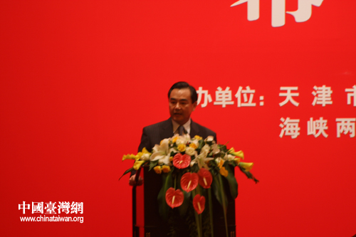 第二屆津臺投資合作洽談會7月29日在天津隆重開幕,中共中央政治局委員、天津市委書記張高麗,中共中央臺辦、國務(wù)院臺辦主任王毅,中國國民黨榮譽(yù)主席連戰(zhàn)、副主席林豐正等出席開幕酒會。圖為中共中央臺辦、國務(wù)院臺辦主任王毅在開幕酒會上致辭。(中國臺灣網(wǎng) 張蕾 攝)