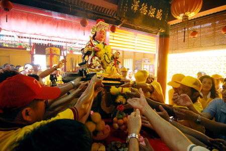 4月27日,在馬來西亞雪蘭莪州巴生港地區(qū)吉膽島(又稱蟹島)一個(gè)華人漁村,村民爭相觸摸媽祖神龕祈求平安。