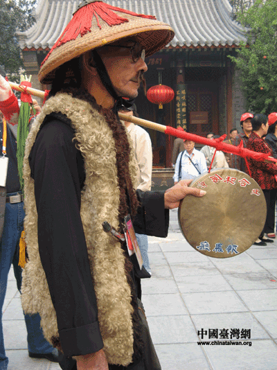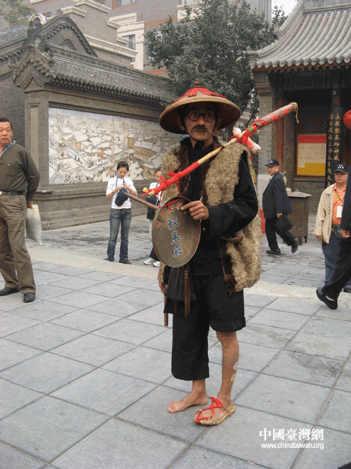 中國臺灣網(wǎng)10月4日消息 在第四屆天津媽祖文化旅游節(jié)的活動上,有這樣一個人因?yàn)檠b扮的怪異而滑稽受到眾人關(guān)注,這就是臺灣媽祖“巡游”隊(duì)伍中走在最前端的報(bào)馬仔。