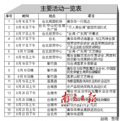 ●2010年8月16日,廣東省省長黃華華帶隊赴臺灣舉行“臺灣·廣東周”活動;顒又黝}為“合作之旅、鄉(xiāng)情之旅”,內(nèi)容包括經(jīng)貿(mào)合作、商品采購、旅游合作、農(nóng)業(yè)合作、文化交流、宣傳亞運等,當(dāng)日還將舉行“萬人游臺灣”首團(tuán)啟動儀式!(記者 陶達(dá)嬪 鄧紅輝)