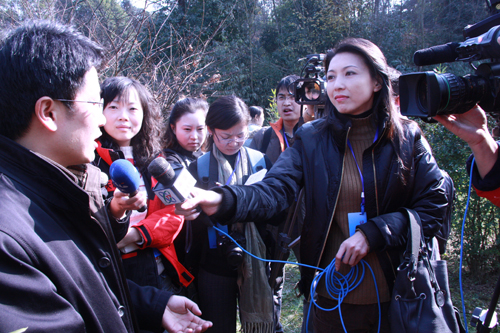 兩岸媒體采訪四川臥龍自然保護(hù)區(qū)管理局副局長(zhǎng)李德生(鐘寶華 攝)
