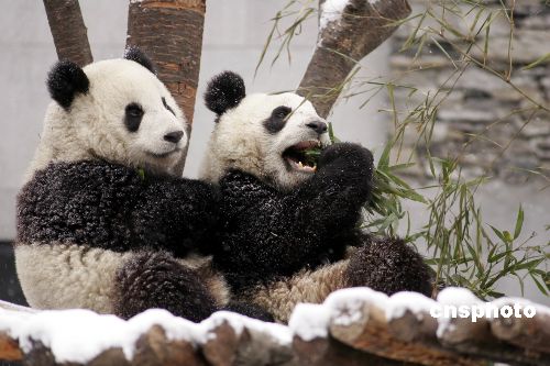 資料圖:贈臺大熊貓團團、圓圓在雪地里嬉戲。