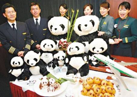 在專機(jī)客艙的內(nèi)裝飾上特別以可愛的貓熊形象布置客艙環(huán)境,機(jī)上餐點及禮品等也別出心裁地以大熊貓為主題,顯示頗具巧思的設(shè)計,“貓熊餅干”、“貓熊面包”等,機(jī)上餐點的命名,都在其中巧妙地融合了“團(tuán)團(tuán)圓圓”的名字,如“團(tuán)團(tuán)一品獅子頭”、“圓圓瓜蓉蒸鮮魚”、“團(tuán)圓如意己丑!钡;在餐點擺盤上,更搭配竹葉或貓熊圖騰做為裝飾,連牛排上也烙印了貓熊的圖案,讓旅客充份感受到貓熊的魅力。