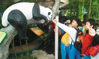 民眾抵達熊貓館后,依序由室外展示場進入。動物園表示,若天氣良好,就可在室外展示場的模擬棲地風景的攀爬架、樹洞、平臺上看見團團、圓圓的身影。進入熊貓館后,民眾先觀看各種大熊貓的保育資料,接著便進入室內(nèi)展示區(qū),隔著4公分厚,經(jīng)防霧處理的玻璃與大熊貓對望。區(qū)內(nèi)也設有大型的樹干,供大熊貓休憩、攀爬。小朋友們參觀展示區(qū)內(nèi)的大熊貓模型,已讓參觀小朋友非常興奮,直喊“要是真的多好。”