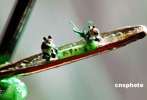 為了迎接12月23日大熊貓“團(tuán)團(tuán)”、“圓圓”的到來,臺灣著名微雕家陳逢顯特地花了半個多月的時間,以樹脂凝膠為材質(zhì),雕刻了一雄、一雌兩只坐在繡花針孔中的立體大熊貓,拉著寫有“我要去臺灣”的條幅。以表達(dá)他對團(tuán)團(tuán)、圓圓到來喜悅的心情。中新社發(fā) 陳立宇 攝