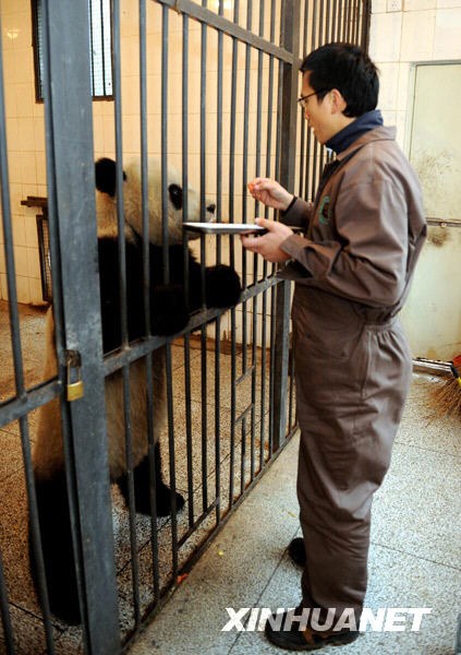 從2008年10月開始,臺(tái)北木柵動(dòng)物園的3名飼養(yǎng)員分兩批來到中國(guó)保護(hù)大熊貓研究中心四川雅安碧峰峽基地,學(xué)習(xí)大熊貓飼養(yǎng)技術(shù)。目前,他們和贈(zèng)臺(tái)大熊貓“團(tuán)團(tuán)”“圓圓”已經(jīng)建立感情,基本掌握了大熊貓飼養(yǎng)技術(shù)。新華社記者陳燮攝