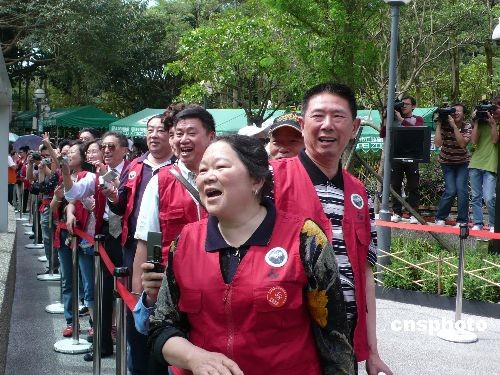 四月十八日上午,四川赴臺灣旅游首發(fā)團(tuán)在臺北動物園熊貓館游覽。圖為團(tuán)員在熊貓館前用四川話呼喚“團(tuán)團(tuán)”、“圓圓”。 中新社發(fā) 鄧敏 攝