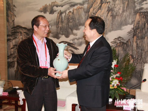 平頂山市長李恩東將著名汝瓷作為禮物送給劉大釧先生(中國臺(tái)灣網(wǎng) 宿靜 攝)