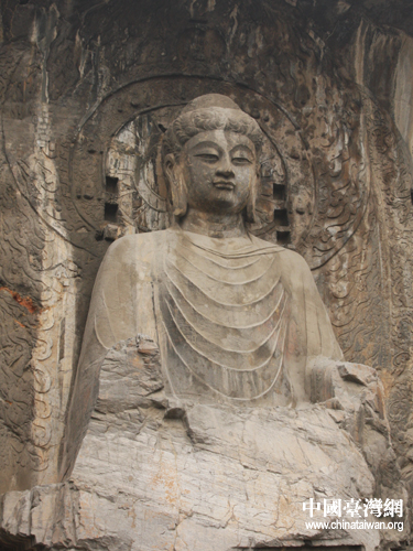 龍門石窟中規(guī)模最大、最精美的盧舍那佛。佛通高17.14米,頭部4米,耳朵1.9米,豐頤秀目,儀表堂堂。(中國臺(tái)灣網(wǎng) 宿靜 攝)