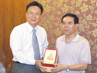 彰化縣長卓伯源(左)贈送河北省委常委聶辰席(右)一座“彰化大佛”雕塑,兩人都說未來將加強(qiáng)推動雙方的交流與合作。圖片來源:經(jīng)濟(jì)日報(bào)