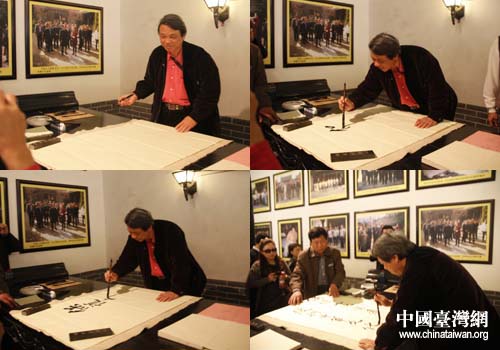 中國(guó)臺(tái)灣網(wǎng)4月10日南陽(yáng)消息 4月9日,“2011年兩岸記者聯(lián)合采訪(fǎng)河南”采訪(fǎng)團(tuán)一行來(lái)到中國(guó)歷史文化名城——河南南陽(yáng)采訪(fǎng)參觀(guān)。置身楚漢文化發(fā)祥地,兩岸記者感慨萬(wàn)千,臺(tái)灣記者即興揮墨題詞,倡導(dǎo)保護(hù)文化資產(chǎn)、復(fù)興中華文化。