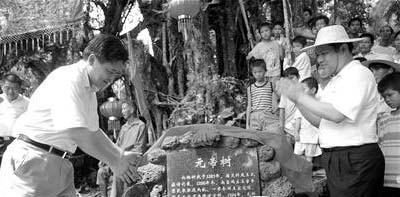 元帝樹揭牌.相傳元朝皇帝圖帖睦爾被流放到海南時,與當(dāng)?shù)乩枋淄豕偎N