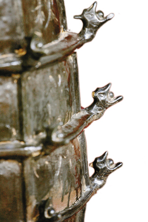 10月3日下午,當這尊黑灰光潤的佛塔擺在丘小君的鑒寶案臺上時,大家的眼睛為之一亮:它高約76厘米,呈六面形,胎質(zhì)灰黑堅硬,黑釉均凈光亮;塔作五級上置葫蘆形頂,底有封閉,一側開有五個佛龕式窗,正檐上塑有含珠龍首;塔身自上而下刻有“禮奉佛塔”“千秋萬代”“風調(diào)雨順”“恩澤子孫”等文字。