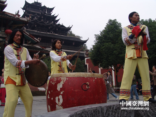 十一月二十日,參加“第四屆兩岸新聞媒體聯(lián)合采訪湖南行”的記者來到張家界境內(nèi)的土家風(fēng)情園,圖為兩岸記者在土家風(fēng)情的打擊樂中盡情起舞!。▓D/李徽)