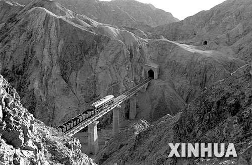 青藏鐵路第一期工程西寧至格爾木段泉吉峽隧道群。 青藏鐵路從西寧至拉薩全長1956公里,是世界上海拔最高、線路最長、穿越凍土里程最長的高原鐵路。把鐵路修進西藏是幾代中國人的夢想,但這一想法直到新中國成立后才逐漸變?yōu)楝F(xiàn)實。青藏鐵路一期工程西寧至格爾木段于1958年開工,1984年交付營運。但限于當時國家的經(jīng)濟實力以及高原、凍土等筑路技術(shù)難題尚未解決,格爾木至拉薩段被迫停建。2001年6月,國家總投資330.9億元動工修建青藏鐵路二期工程。這一工程跨越昆侖山、唐古拉山,通過多年凍土層和大片“生命禁區(qū)”,是人類鐵路建設(shè)史上亙古未有的穿越。它的建成將為神秘而古老的青藏高原帶來新的生機和活力! 新華社發(fā)