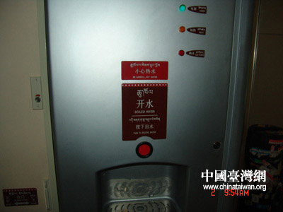 列車上獨(dú)特的開(kāi)水飲水機(jī),文字采用三種語(yǔ)言,人性化服務(wù)令人溫馨