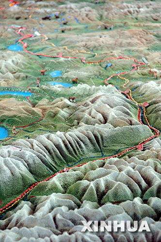 在青藏鐵路沙盤上,代表高原鐵路的紅色線條在沙盤中曲折延伸(6月15日攝)。