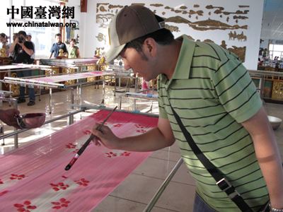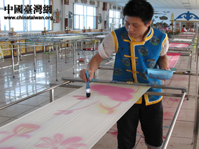 中國臺灣網(wǎng)7月23日包頭消息 “原來漂亮的披肩就是這樣制作的!弊蛱煜挛,兩岸記者在包頭見識到了羊絨手繪披肩的全部制作過程。(張弛 攝)