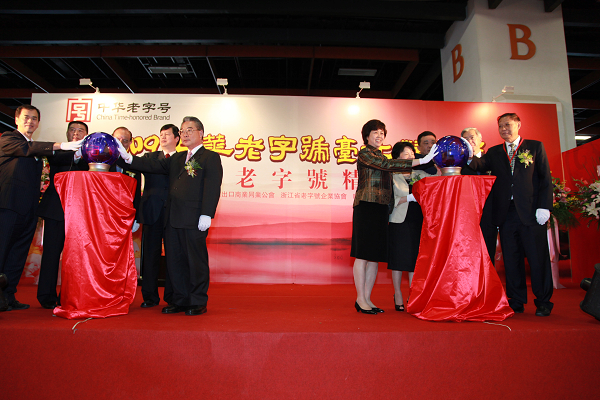 臺(tái)灣主持人首先向大家介紹參加這次開幕式的兩岸貴賓。然后,請(qǐng)臺(tái)北市進(jìn)出口商業(yè)同業(yè)工會(huì)理事長(zhǎng)許勝雄、國(guó)民黨副主席林豐正、浙江省老字號(hào)企業(yè)協(xié)會(huì)會(huì)長(zhǎng)馮根生、浙江省經(jīng)濟(jì)貿(mào)易委員會(huì)主任湯黎路等主要貴賓上臺(tái)致詞。在浙臺(tái)主要貴賓共同啟動(dòng)魔球中老字號(hào)精品展正式開始。