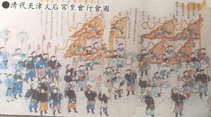 康熙、乾隆兩位皇帝如此頻繁地駕臨天津,早就驚動(dòng)了由鹽商、錢(qián)商、糧商等富商大戶們支持并操辦的天津各色老會(huì)、圣會(huì);实勖看纬鲅,一來(lái)一去,地方上必定要舉行接駕、送駕的隆重儀式。于是乎,那些平時(shí)自?shī)首詷?lè)或?yàn)閺R會(huì)、香會(huì)各呈演技的老會(huì)、圣會(huì)又搖身一變,成了接駕和送駕的極富特點(diǎn)的儀仗隊(duì)。