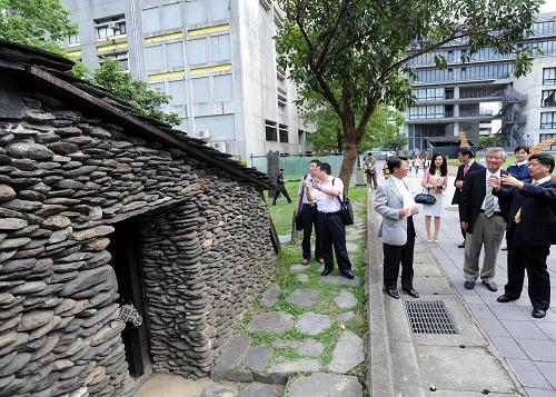 9月23日,大陸少數(shù)民族大學(xué)生文化交流團(tuán)成員在臺(tái)灣實(shí)踐大學(xué)校園內(nèi)參觀臺(tái)灣原住民石板屋。新華社發(fā)(吳景騰 攝)