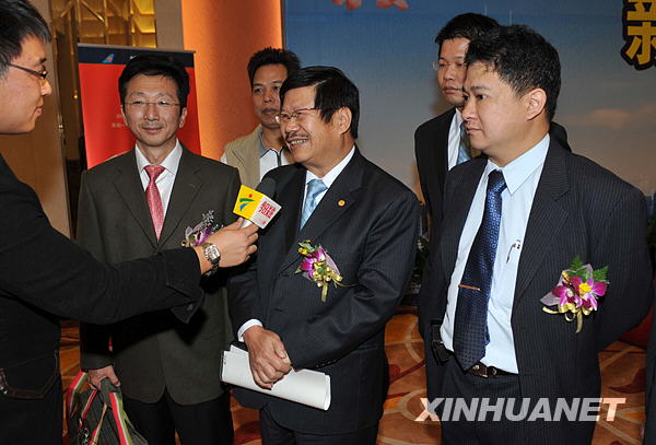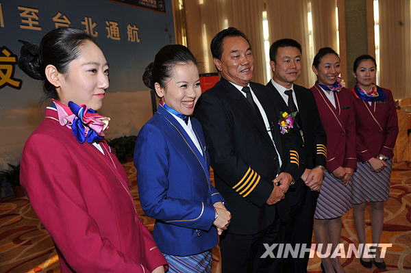 12月10日,南航首次直航臺北的機長劉湘衡(左三)和乘務(wù)長石菁(左二)率領(lǐng)部分機組人員出席新聞發(fā)布會。中國南方航空公司將于12月18日執(zhí)行兩岸直航包機任務(wù)。南航深圳至臺北直航包機為每周兩班,逢周四、周六執(zhí)行。新華社記者壯錦攝