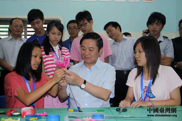 應(yīng)中共四川省委書記劉奇葆邀請,臺灣云林縣、南投縣和彰化縣的105名師生,由臺灣民意代表馬文君、王惠美帶隊,赴四川參加第三屆“臺灣學(xué)生天府夏令營”活動。圖為劉奇葆攜臺灣師生一起走進(jìn)四川科技館,并與臺灣小朋友共同制作絲網(wǎng)花。(中國臺灣網(wǎng) 王偉 攝)