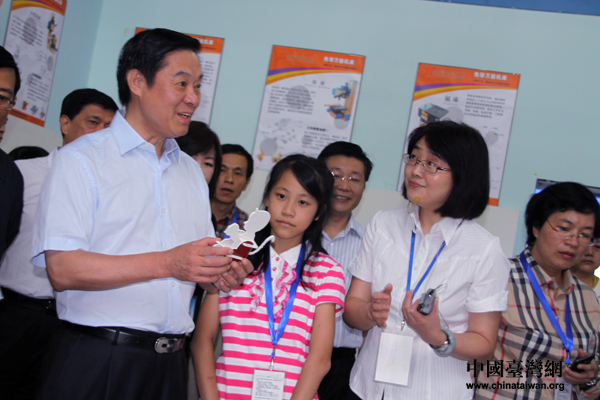應(yīng)中共四川省委書記劉奇葆邀請,臺灣云林縣、南投縣和彰化縣的105名師生,由臺灣民意代表馬文君、王惠美帶隊,赴四川參加第三屆“臺灣學(xué)生天府夏令營”活動。圖為劉奇葆饒有興致地欣賞臺灣小朋友制作的模型。(中國臺灣網(wǎng) 王偉 攝)