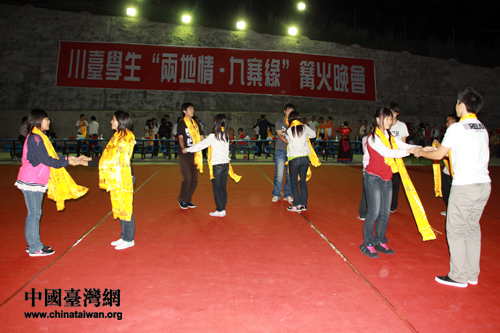 夜空下的九寨溝略顯寒意,溝漳扎小學(xué)的篝火旁卻暖意融融,倍感溫馨。在場的所有人跳起歡樂的鍋莊,享受著民族獨(dú)特的魅力。相信在未來的歲月中,在場的兩岸青年學(xué)子都會銘記住這個歡樂而難忘的夜晚。(中國臺灣網(wǎng)記者 王偉)