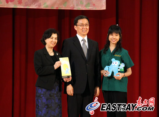 上海市長韓正向臺灣11所中學(xué)的學(xué)生贈送上海世博會門票和世博吉祥物“海寶”。(圖片來源:東方網(wǎng))