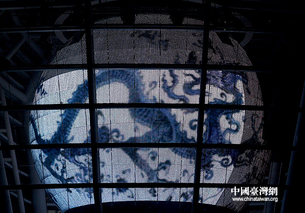 臺(tái)灣館點(diǎn)燈祈福儀式現(xiàn)場(chǎng),720度球幕上“綻放焰火”慶祝。(中國(guó)臺(tái)灣網(wǎng) 鐘寶華 攝)