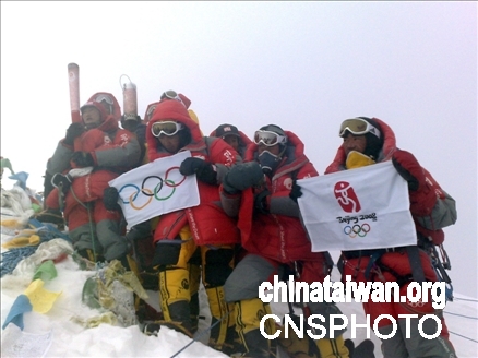 北京奧運圣火成功登頂珠峰:展示火炬、國旗、奧運五環(huán)旗、會徽旗