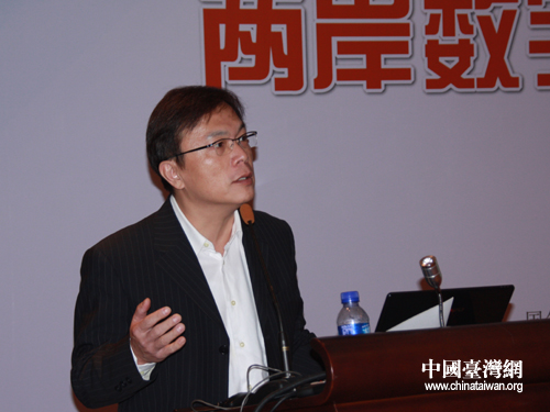 昱泉國際營運(yùn)長凌明源在兩岸數(shù)字內(nèi)容及產(chǎn)業(yè)孵化論壇上作主題演講(中國臺(tái)灣網(wǎng) 高斯斯 攝)