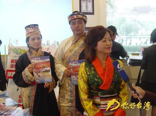在大陸展區(qū)里,各省市代表團爭相凸顯各自的旅游特色,山光水色濃縮在展區(qū)當中,讓人目不暇接。圖為西藏旅游屆代表接受臺灣媒體采訪。