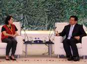 中共中央總書記胡錦濤19日下午在人民大會堂會見了高金素梅率領的臺灣少數民族代表團全體成員,并發(fā)表了即席講話。