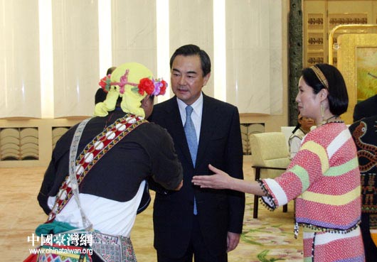 8月19日下午,中共中央臺(tái)辦主任王毅在北京人民大會(huì)堂會(huì)見(jiàn)了高金素梅率領(lǐng)的臺(tái)灣少數(shù)民族代表團(tuán)一行。(中國(guó)臺(tái)灣網(wǎng) 鐘寶華 攝)