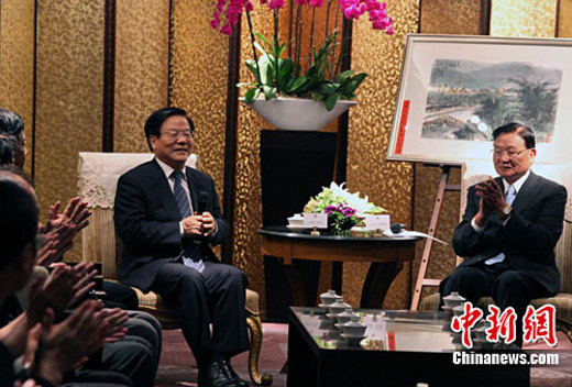 中華文化聯(lián)誼會名譽(yù)會長蔡武7日在臺北會見;鶗麻L江丙坤。蔡武向江丙坤表示,“共同努力推進(jìn)文化交流”是兩岸文化界的迫切心愿和共同需求,雙方需認(rèn)真面對相關(guān)問題。