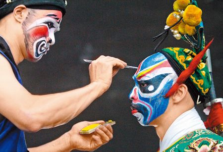圖為開課前臺(tái)灣丑角演員林朝緒(左)幫師弟曾冠東(右)化妝。圖片來源:臺(tái)灣中國時(shí)報(bào)