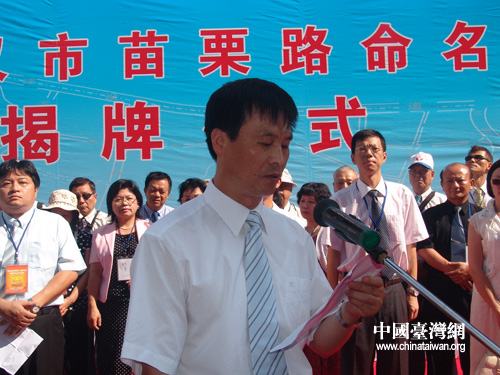 武漢市委副書記胡曙光、中國國民黨苗栗縣黨部訪問團領(lǐng)隊江村貴為苗栗路揭牌(攝影:陳寧)