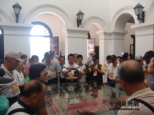 臺灣參訪團在紅樓模型前拍照留念。(攝影:陳寧)