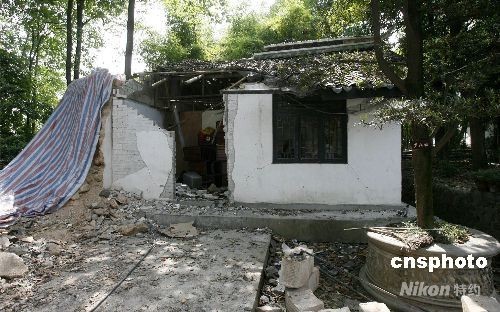 六月五日,四川江油李白故里被損壞的梁柱。受汶川地震影響,江油李白故居房屋全部拉裂,部分垮塌,清代建筑幾乎全部倒塌。有關文物部門初步估算,修復李白故里的費用可能達到三千萬至五千萬元人民幣。 中新社發(fā) 慎重 攝