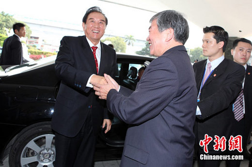2月24日,海協(xié)會(huì)會(huì)長(zhǎng)陳云林跨越濁水溪進(jìn)行在臺(tái)灣中南部的經(jīng)貿(mào)考察之旅,他形容首次到高雄,心情很激動(dòng)。圖為當(dāng)天下午,陳云林乘車來到楠梓出口加工區(qū)參觀,受到熱情歡迎。中新社記者 董會(huì)峰 攝