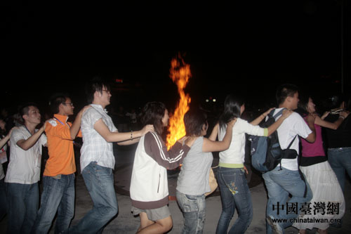 海邊點起篝火,兩岸營員聞歌起舞