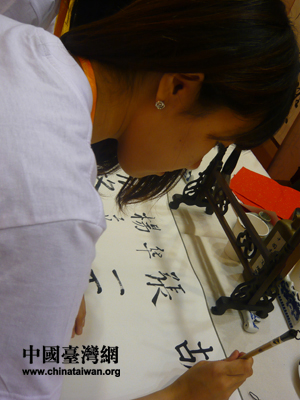 兩岸大學生在中華優(yōu)秀傳統(tǒng)文化展示和體驗活動中用毛筆書法簽下自己的名字。(中國臺灣網(wǎng) 栗琰 攝)