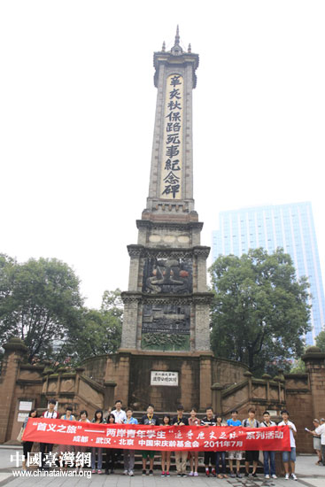 7月2日,“追尋歷史足跡”系列活動——首義之旅在成都拉開帷幕,來自臺灣十大杰出青年基金會成員與大陸大學生志愿者在成都人民公園——“辛亥革命紀念塔”一同合影(中國臺灣網 李丹 攝)