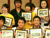 幾名臺灣青年在蘇州“兩岸青年聯(lián)歡節(jié)”上展示獲贈的蘇繡紀(jì)念品。