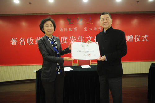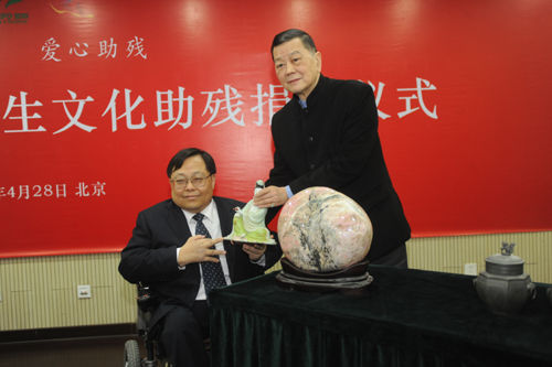 人民網(wǎng)北京5月4日電 日前,臺灣著名收藏家王度先生向中國殘聯(lián)文化助殘事業(yè)捐贈(zèng)簽字儀式在中國殘聯(lián)舉行。他把多年收藏的近200件臺灣玫瑰石及其它藝術(shù)品捐贈(zèng)給中國殘聯(lián)華夏文化集團(tuán),用于支持文化助殘事業(yè)。中國殘聯(lián)副主席、常務(wù)副理事長王乃坤向王度先生頒發(fā)了上海世博會(huì)生命陽光館愛心大使榮譽(yù)證書;中國殘聯(lián)副主席、黨組成員呂世明接受了捐贈(zèng);中國殘聯(lián)宣文部主任王濤,中國殘聯(lián)文化助殘辦公室負(fù)責(zé)人宋體金,中國殘聯(lián)華夏文化集團(tuán)總裁助理劉海軍等出席捐贈(zèng)儀式。