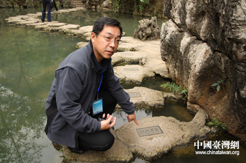 21日上午,到訪貴州的臺灣嘉賓先來到以石林景觀見長的天星橋景區(qū),欣賞了“水上石林”,他們認(rèn)真走過一年中的“每一天”,找尋刻有自己生日的那塊石頭。嘉賓們對于導(dǎo)游介紹的每個典故都認(rèn)真觀看,到底美女是頭朝上還是頭朝下呢?這個藤是從哪伸出來的?認(rèn)真思考的表情很是可愛。