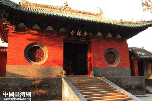 圖為河南省嵩山少林寺 少林寺常住院中軸線現(xiàn)有七進院落,占地面積約36000平方米,保存宋、明、清建筑多座,是一處禪、武結(jié)合的文化圣地。山門的正門是一座面闊三間的單檐歇山頂建筑,它坐落在兩米高的磚臺上,左右配以硬山式側(cè)門和八字墻,整體配置高低相襯,十分氣派。門額上有清康熙帝親筆所提“少林寺”三個大字,更添一道輝煌的景色。(中國臺灣網(wǎng) 徐維彬 攝)