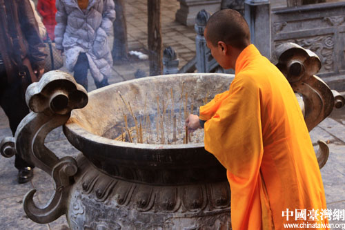 圖為少林弟子燃香(中國臺灣網(wǎng) 徐維彬 攝)